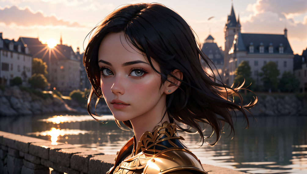 Step into a world of enchantment and timeless beauty with "Ethereal Elegance," an awe-inspiring album crafted by the power of AI. This collection features captivating portraits of a medieval heroine, adorned in shimmering gold armor, set against a backdrop of majestic castles and the radiant glow of intense sunlight.